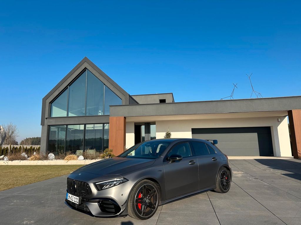 Optisch überzeugt der A 45 AMG mit einem aggressiven Design, das die sportlichen Gene von Mercedes-AMG klar zur Schau stellt. Die markante Frontpartie sowie die breiten Kotflügel betonen die Motorleistung und verleihen dem Fahrzeug eine imposante Präsenz auf der Straße. Im Innenraum setzt sich die sportliche Gestaltung mit hochwertigen Materialien und modernster Technik fort, wobei der Fahrer in einem Umfeld platziert wird, das sowohl Komfort als auch Funktionalität bietet. Das Cockpit ist mit einem hochauflösenden Infotainment-System ausgestattet, das eine Vielzahl von Anschlussmöglichkeiten bietet, darunter Apple CarPlay und Android Auto. Dies gört zu einem nahtlos integrierten Fahrerlebnis, das sowohl für den Alltag als auch für sportliche Fahrten bestens geeignet ist.